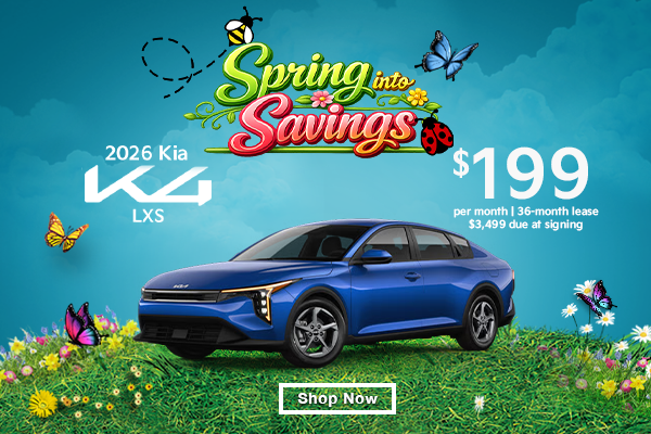 2026 Kia K4 LXS $199 per month | 36-month lease $3,499 due at signing $3,499 due at Signing. Offer shown based on $3,499 due at signing including $199 first monthly payment, $2,650 capitalized cost reduction, $650 acquisition fee, plus tax, title, license and registration fees, dealer conveyance fee, processing fee or optional service fee and any emission testing charge. Lease offer is only available to well-qualified lessees that lease a 2025 K4 (Model #2AC3224). No security deposit required. Actual payments may vary. Purchase option at lease end is $14,752.85. Subject to credit approval by Kia Finance. Lessee is responsible for insurance, maintenance, repairs, $0.20 per mile over 10,000 miles/year, excess wear, and a termination fee of up to $400. Subject to dealer participation. Offers may not be combined except where specified. Must take delivery by 05/04/2026.